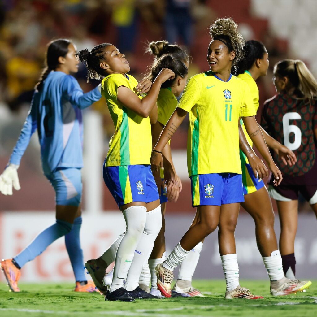 O primeiro tempo foi de controle brasileiro, mas sem gols. A atacante Vitorinha chegou perto de abrir o placar em cobrança de falta, e Dudinha e Gisele também exigiram boas defesas da goleira Camila Vasquez. O México respondeu com finalização perigosa de Abril Fragoso, mas o empate sem gols persistiu até o intervalo.